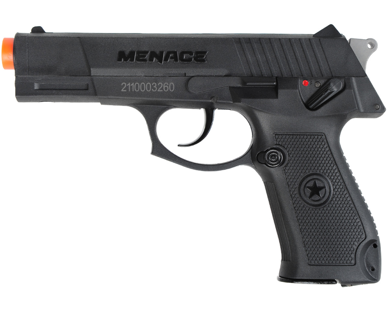 Construido con materiales compuestos duraderos, la Menace funciona con cartuchos de CO2 de 0.42 oz para un rendimiento confiable. Un cargador de 7 rondas incluido garantiza que siempre estés listo para la acción